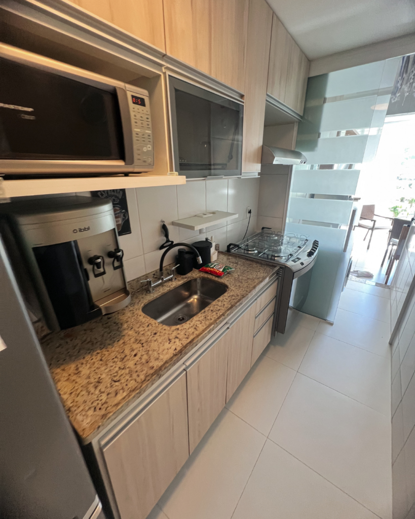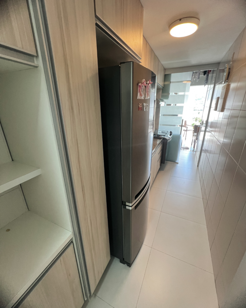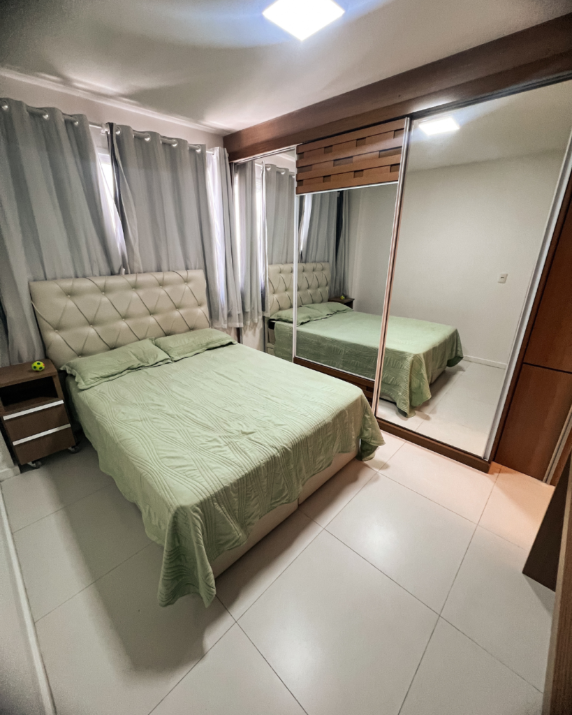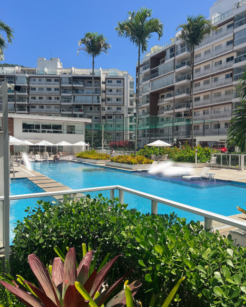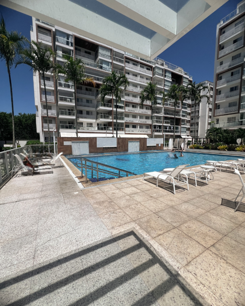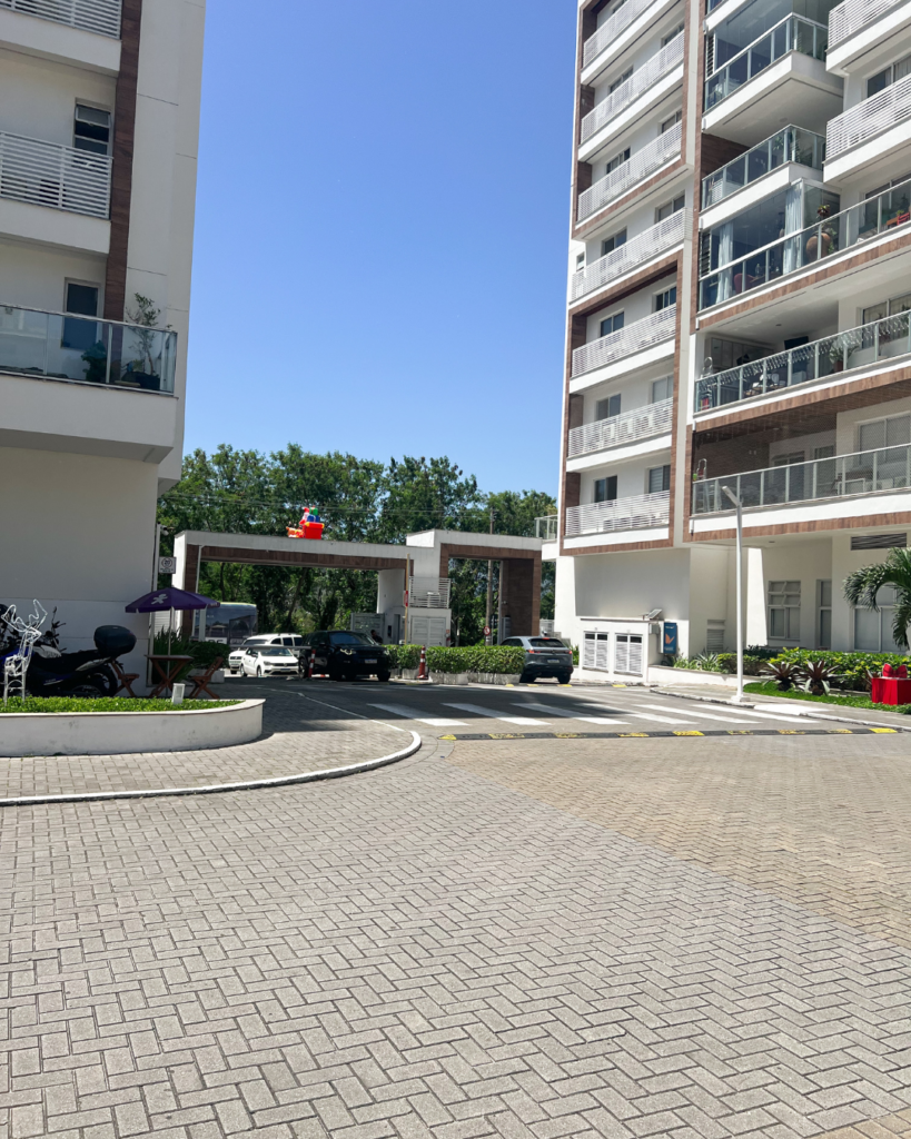 O condomínio conta com piscinas, academia, salão de festas, segurança e portaria 24h, além de garagem coberta.